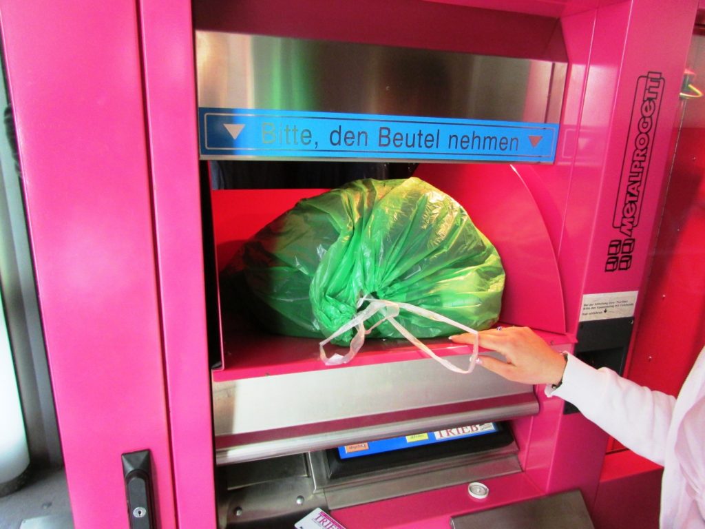Die Waschbox ist beim Seiteneingang 24H geöffnet Sollte die Eingangstür zu sein Benutzen Sie bitte Ihre Girocard oder Kreditkarte un die Tür zu öffnen Drinnen finden Sie die Station vor Das Display bedienen Sie mit Ihren Fingern Bitte “Teile abgeben” auswählen Jetzt bitte Ihre Handynummer eingeben Auf diese bekommen Sie eine SMS wenn die Wäsche fertig ist Jetzt die Anzahl der Teile die Sie abgeben Mit dem grünen Button Bestätigen Oberhalb des Monitors wird eine Plastiktüte rausfallen Aus dem Drucker links kommen zwei Belege Einen Beleg bitte mit der Wäsche in die Tüte packen Den Beutel zubinden Oberhalb des Monitors die Klappe aufmachen Die Tüte in das Fach legen Das Fach wieder zu machen – FERTIG