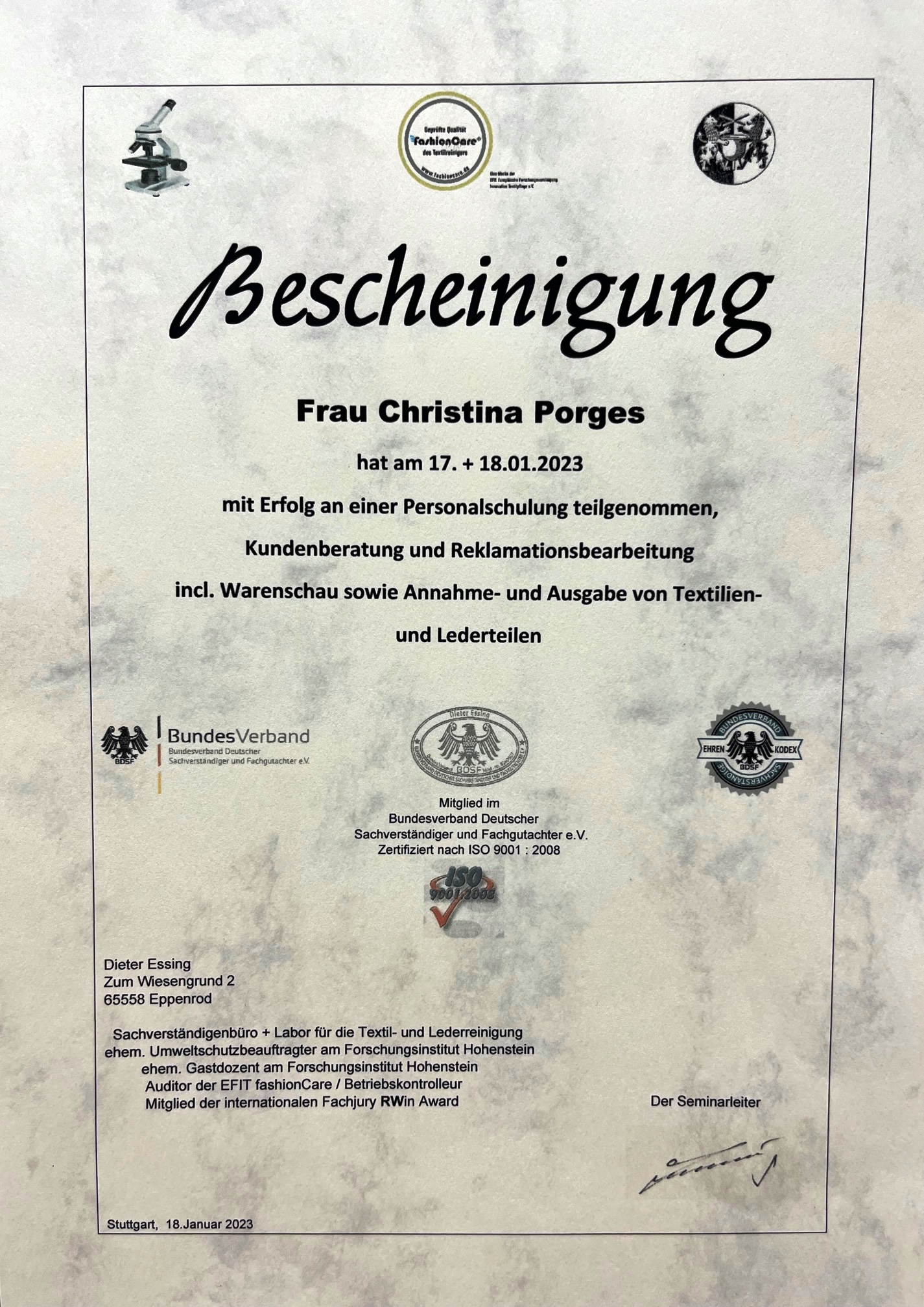 Ein gut geschulter Mitarbeiter ist der Garant für eine Qualität die wir, als die älteste Meisterreinigung der Stadt seit fast 100 Jahren liefern. Es freut uns sehr dass die Kollegen sich so gern weiterbilden lassen. Auch der Chef und Frau Porges haben sich schulen lassen.